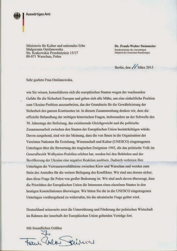 Вот, например, письмо министра иностранных дел Германии Франка-Вальтера Штайнмайера главе минкульта Польши г-же Омилановской, осмелившейся подать заявку в ЮНЕСКО на оценку Волынской резни 1943 года.