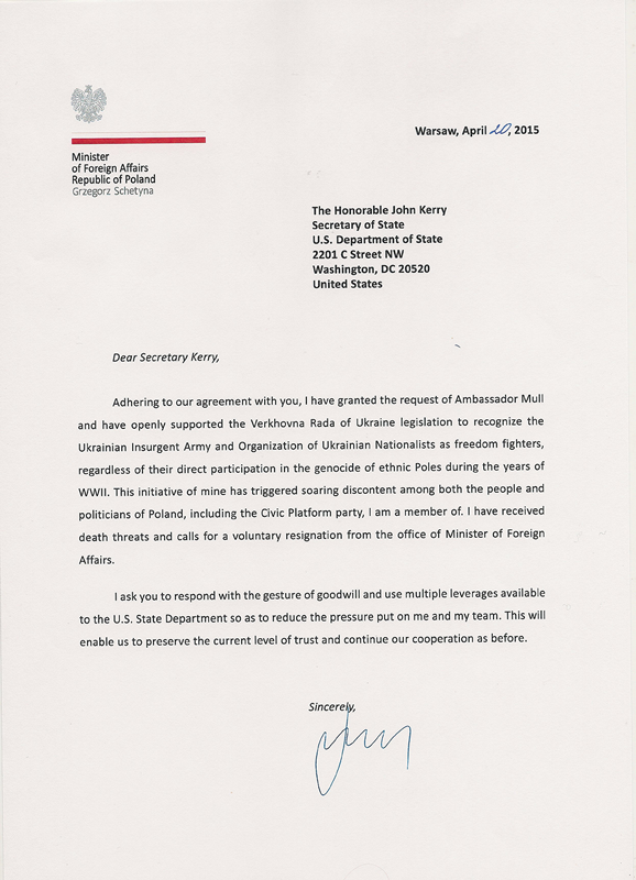 Соблюдая достигнутые с Вами договоренности, я выполнил просьбу посла Мулла и публично выступил с поддержкой законопроекта Верховной рады Украины о признании Украинской повстанческой армии* и Организации украинских националистов борцами за независимость Украины, несмотря на их причастность к гибели более 100 тысяч этнических поляков. Данный шаг спровоцировал резкий рост недовольства как среди общественности, так и в политических кругах Польши, включая партию «Гражданская платформа», членом которой я являюсь. В мой адрес поступают угрозы физической расправы и призывы добровольно уйти в отставку с поста министра иностранных дел.