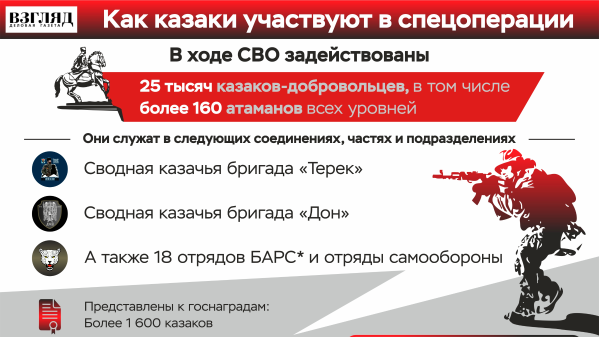 Казачьи соединения, части и подразделения стали одними из наиболее эффективных среди всех добровольческих воинских формирований, принимающих участие в СВО. О том, сколько казаков и каким образом участвуют в спецоперации – в нашей инфографике.