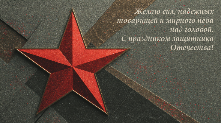 «Поздравляю с Днем защитника Отечества! Пусть сила характера помогает справляться с любыми задачами, а рядом всегда будут надежные люди и поддержка близких. Желаю уверенности, спокойствия и множества поводов для гордости. Пусть каждый новый день приносит радость и ощущение внутренней гармонии».