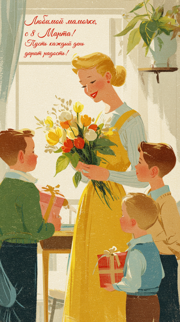 Отдельный пласт праздничной культуры – советские открытки, которые сегодня переживают второе рождение. Ретро-открытки СССР привлекают своей душевностью, узнаваемым стилем графики и особым шармом. На них обязательно присутствуют мимоза, тюльпаны, весенние пейзажи, а также изображения женщин-тружениц, матерей, бабушек в окружении детей и цветов.