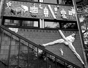 Долгая редакционная вражда между двумя известными немецкими газетами привела к грандиозному медиаскандалу. Газета Tageszeitung разместила на фасаде здания редакции объемное изображение обнаженного главного редактора конкурирующей газеты Bild Кая Дикмана. Примечательно, что акцент сделан на половом органе, который устремлен вверх на пять этажей, пишет Spiegel.