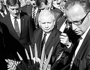 Экс-премьер, брат-близнец погибшего под Смоленском президента Польши Леха Качиньского Ярослав Качиньский 10-го числа каждого месяца проходит во главе колонны своих сторонников к Президентскому дворцу. Демонстранты требуют от властей проверить версию о покушении, обвиняют руководителей РФ и Польши в заговоре.