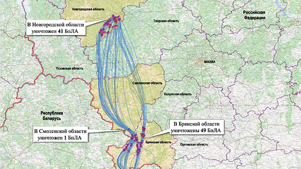 На карте отмечены места, где были уничтожены украинские БПЛА. В частности, один дрон поразили в Смоленской области, 49 – в Брянской, а 41 – в Новгородской.