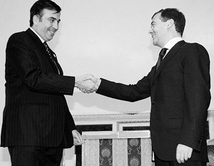 «По-моему, в начале июня, то есть буквально через несколько недель после официального вступления в должность (президента России), мне позвонил Саакашвили, и мы с ним обсуждали какие-то текущие вопросы... В общем, был такой вполне нейтральный разговор. Я высказал пожелание продолжить общение, поговорить по всей совокупности наших отношений. Что и произошло уже буквально через несколько дней, по-моему, когда мы встретились на саммите стран СНГ в Петербурге», - вспоминает Медведев.