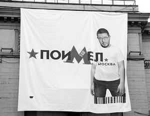 С самого утра на Тверской улице – на фасаде жилого дома напротив московской мэрии – появился огромный баннер, на котором изображен известный веб-дизайнер Артемий Лебедев в майке с «официальным» логотипом Москвы. На плакате было написано: «поиМел», буква «М» в этом слове представляет собой разработанный недавно лебедевской студией логотип Московского метрополитена.