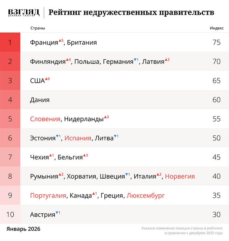 Согласно «Рейтингу недружественных правительств» за январь (.pdf), страны ЕС несколько снизили агрессивность в отношении России – среднее значение индекса враждебности упало на 15,2 пункта. Эксперты связывают это с обострившимся противостоянием Брюсселя и Вашингтона из-за контроля над Гренландией, что «отвлекло» Старый Свет от конфронтации с Москвой.
