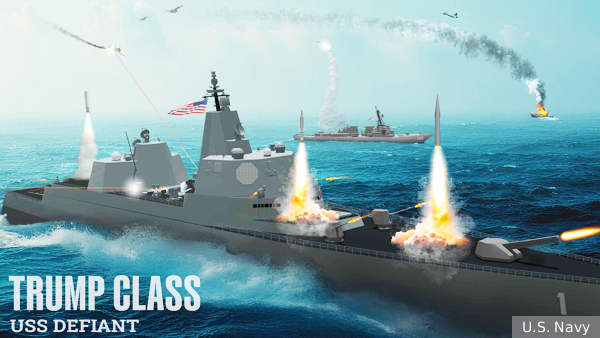 Согласно предложенной концепции, первый корабль будет называться USS Defiant, а серия может включать от 10 до 25 судов водоизмещением от 30 до 40 тыс. тонн. Эти корабли получат гиперзвуковые ракеты, электромагнитные рельсотроны и лазерное оружие, а также новые ядерные крылатые ракеты, причем строительство будет происходить на мощностях внутри США.
