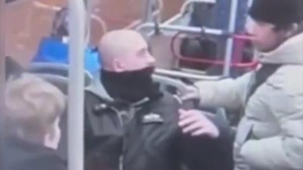 На видео, которое разместила журналистка, видно как несколько молодых людей в коротких черных куртках с капюшонами и в берцах показывают неприличные жесты, после чего один из пассажиров автобуса подходит к ним и что-то говорит. После чего все направляются к выходу.