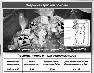 В ведомстве подчеркнули, что «грязная бомба» представляет собой контейнер с радиоактивными изотопами и зарядом взрывчатого вещества. При подрыве заряда контейнер разрушается, а радиоактивное вещество распыляется ударной волной, создавая при этом радиоактивное загрязнение местности на больших территориях, а также может привести к возникновению лучевой болезни.