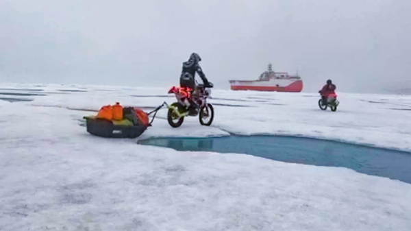 Мотоциклисты Юрий Волков и Кирилл Дрыгин во время экспедиции установили три мировых рекорда. Так, байкеры впервые проехали арктические широты на мотоциклах, достигли на них льдов Северного полюса и побили рекорд по самому длинному мотопробегу на льду, передает ГТРК Мурман.