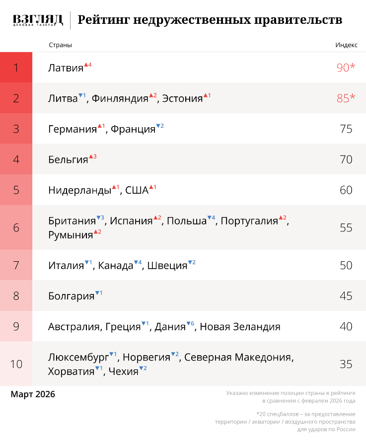 Мартовский «Рейтинг недружественных правительств» газеты ВЗГЛЯД зафиксировал рекордный уровень враждебности со стороны стран Прибалтики и Финляндии. Их агрессивные действия позволили им впервые обогнать многократных лидеров – Францию и Германию. При этом наблюдаются и некоторые положительные тенденции: враждебность со стороны США продолжает снижаться.
