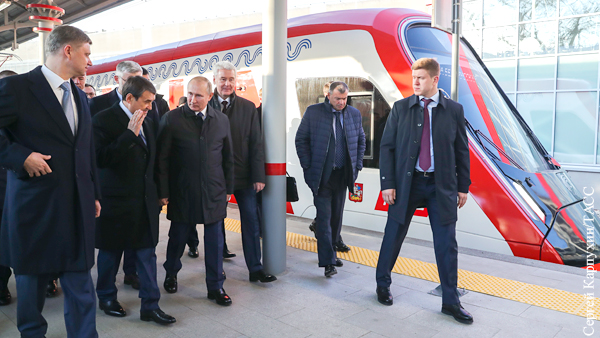 Всего планируется запустить пять диаметров, пока заработали два из них – МЦД-1 свяжет Одинцово и Лобню, а МЦД-2 – Нахабино и Подольск (на фото слева направо: глава РЖД Олег Белозеров, помощник президента Игорь Левитин, министр транспорта Евгений Дитрих, президент Владимир Путин, мэр Москвы Сергей Собянин) (фото: Рамиль Ситдиков/РИА «Новости»)