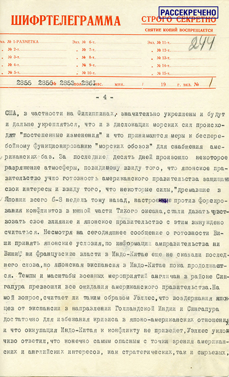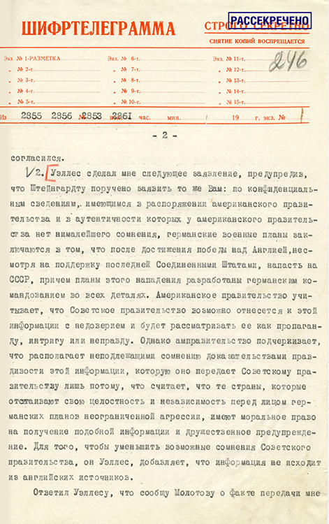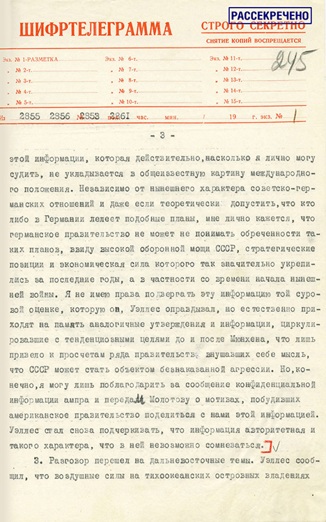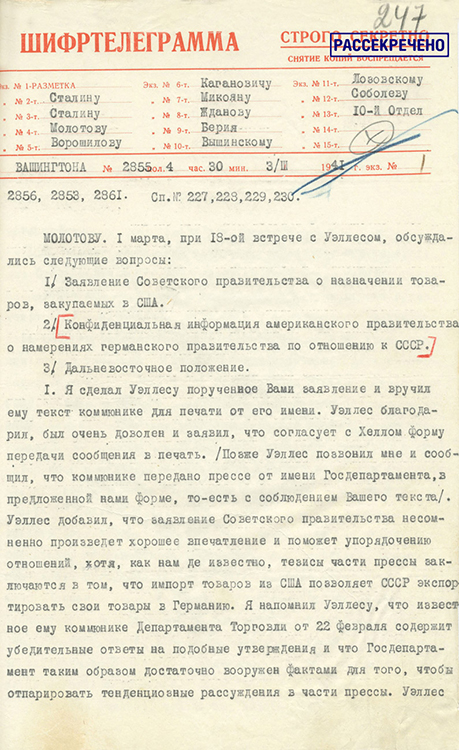 Шифртелеграмма полномочного представителя СССР в США К.А.Уманского в Народный комиссариат иностранных дел о беседе с заместителем государственного секретаря США С.Уэллесом относительно возможного нападения Германии на СССР. 1 марта 1941 г. (фото: Историко-документальный департамент МИД России)