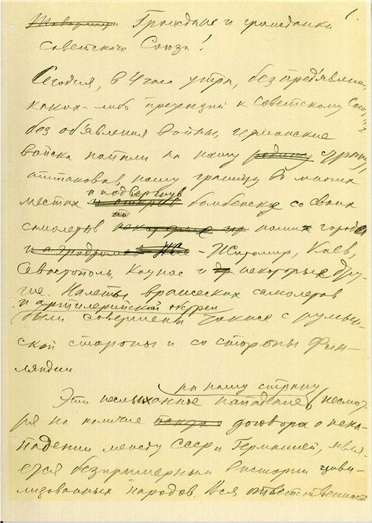 22 июня 1941 г. «Сегодня, в 4 часа утра без предъявления каких-либо претензий к Советскому Союзу, без объявления войны, германские войска напали на нашу страну, атаковали наши границы во многих местах и подвергли бомбежке со своих самолетов наши города…
