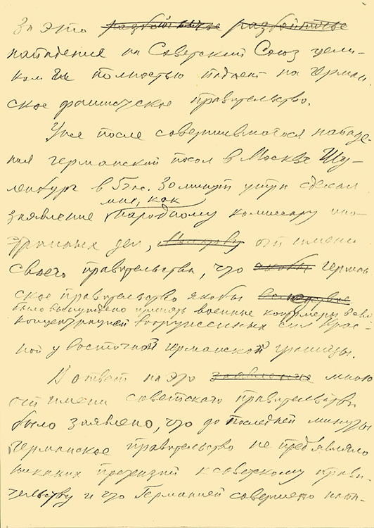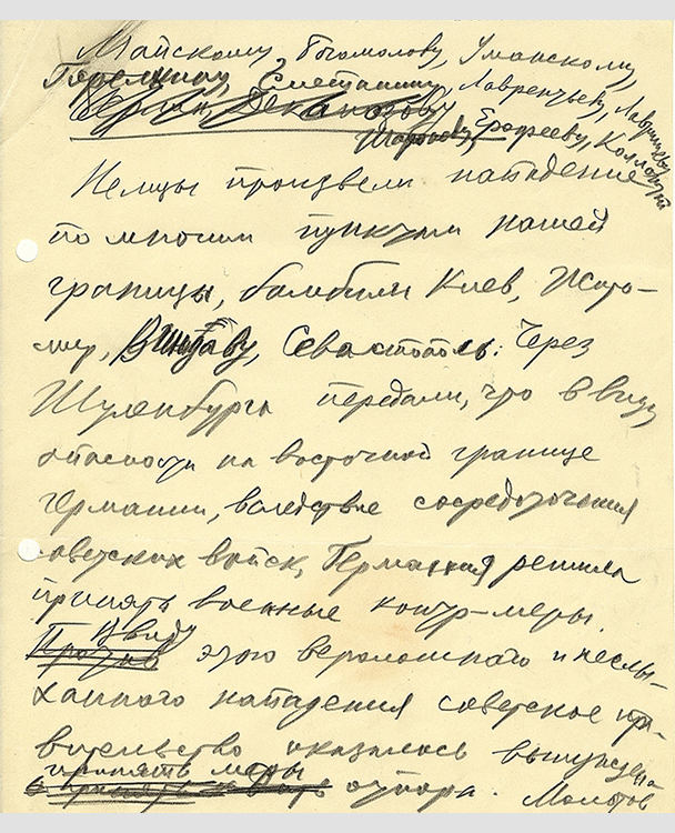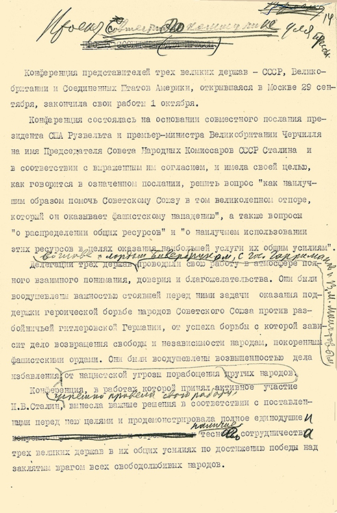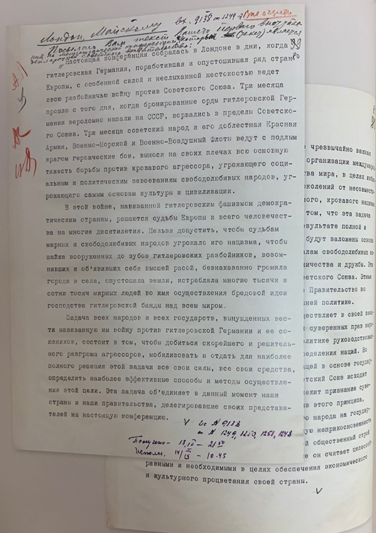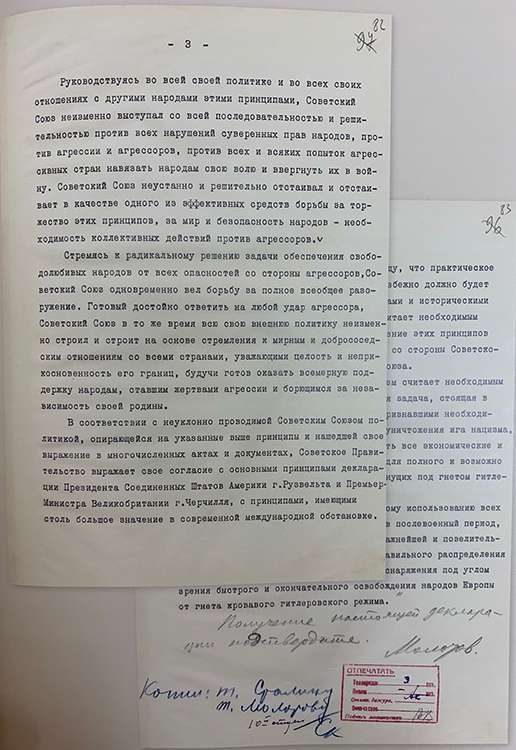 Шифртелеграмма В.М.Молотова И.М.Майскому с текстом Декларации правительства СССР на Межсоюзнической конференции в Лондоне от 24 сентября 1941 г. Правка по тексту В.М.Молотова (фото: Историко-документальный департамент МИД России)