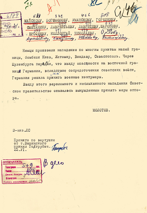 Телеграмма В.М.Молотова (фото: Историко-документальный департамент МИД России)