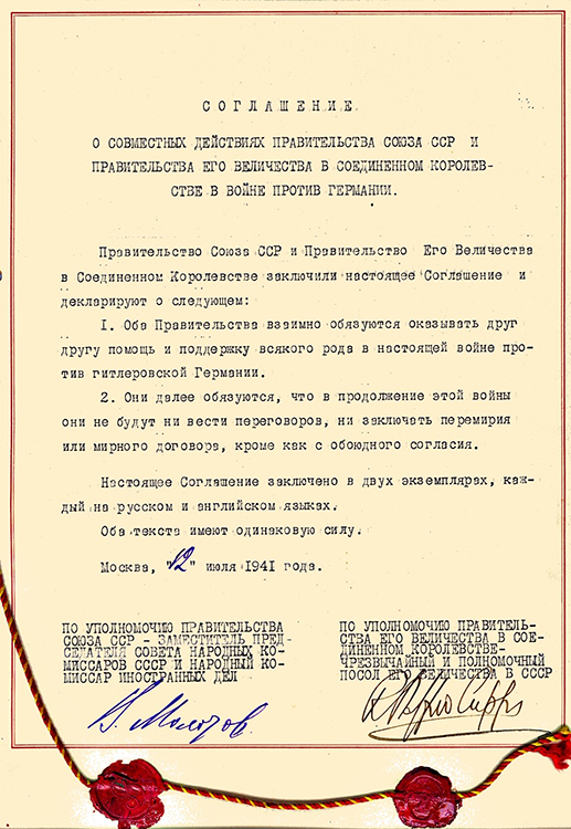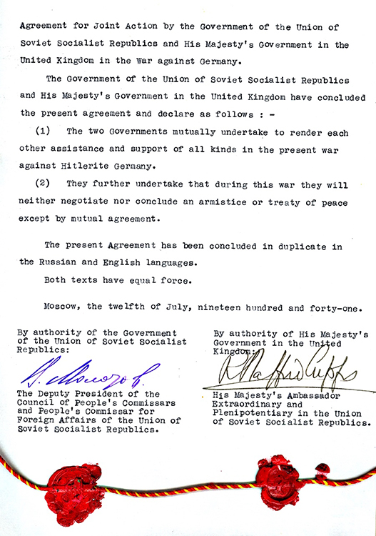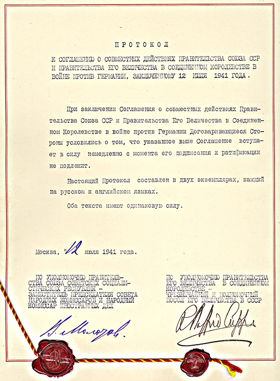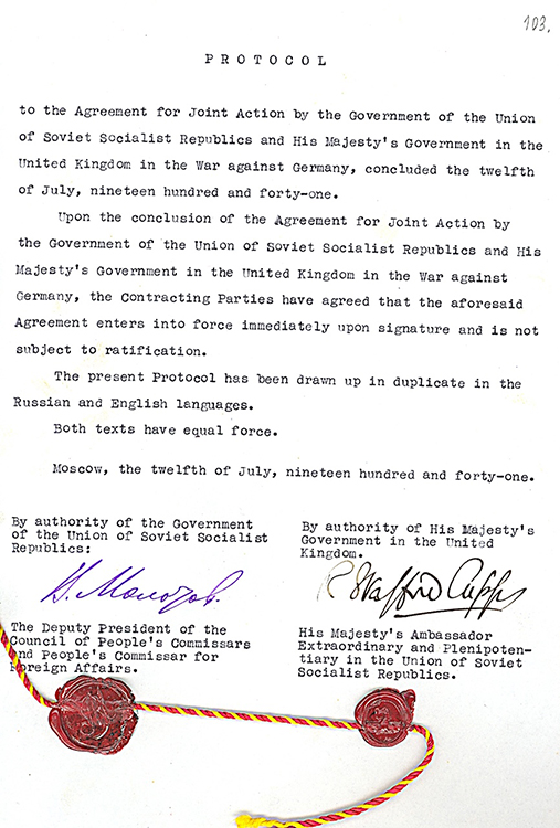 Соглашение и Протокол о совместных действиях Правительства СССР и Правительства Его Величества в Соединенном Королевстве в войне против Германии. Москва. 12 июля 1941 г. (фото: Историко-документальный департамент МИД России)