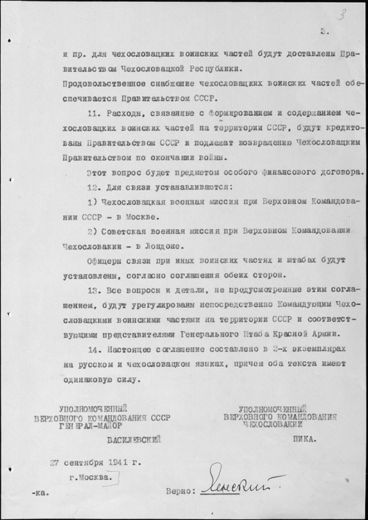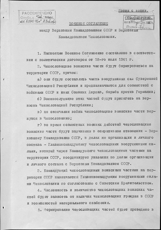 Копия военного соглашения между Верховным Командованием СССР и Верховным Командованием Чехословакии. 27 сентября 1941 г. (фото: Историко-документальный департамент МИД России)