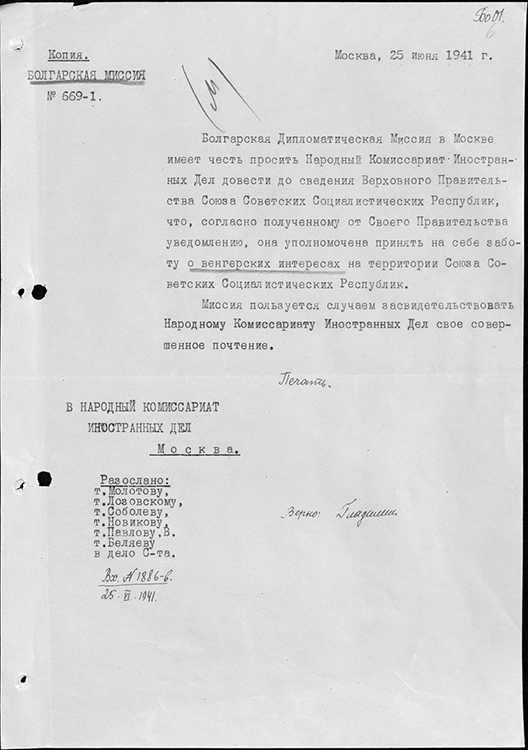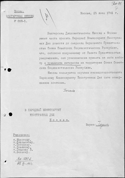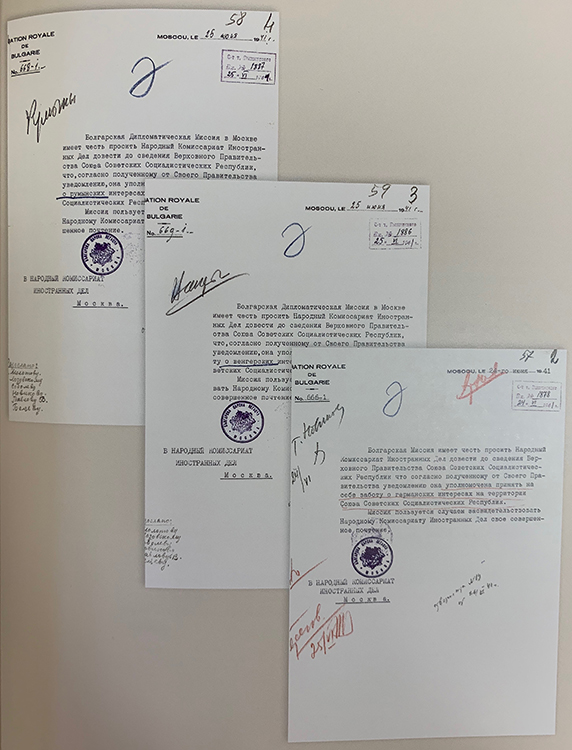 Ноты миссии Болгарии в НКИД СССР о представлении в СССР интересов Германии, Венгрии, Румынии (фото: Историко-документальный департамент МИД России)