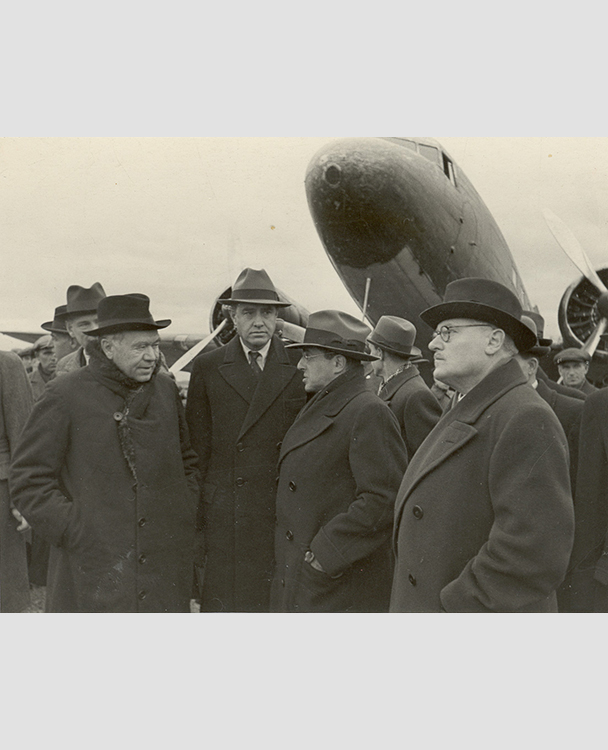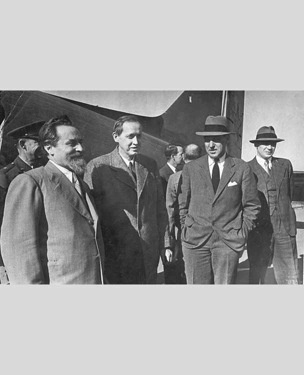 Прибытие личного представителя Президента США Ф.Рузвельта Г.Гопкинса в Москву, 30 июля 1941. Слева направо: заместитель наркома иностранных дел СССР С.А.Лозовский, Г.Гопкинс, посол США в СССР Л.Штейнгардт (фото: Историко-документальный департамент МИД России)