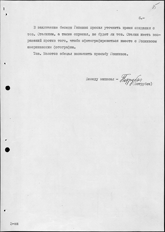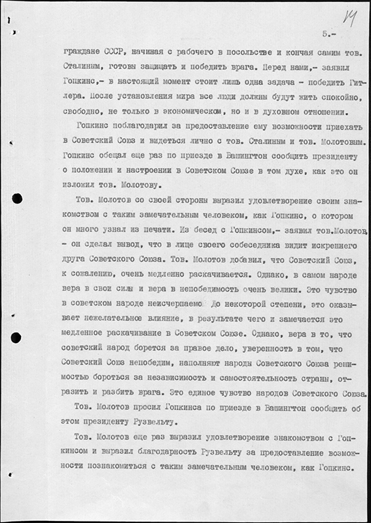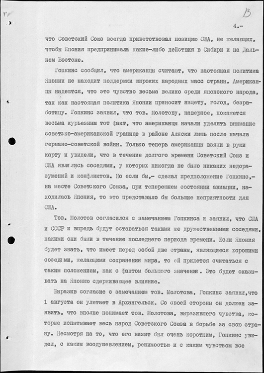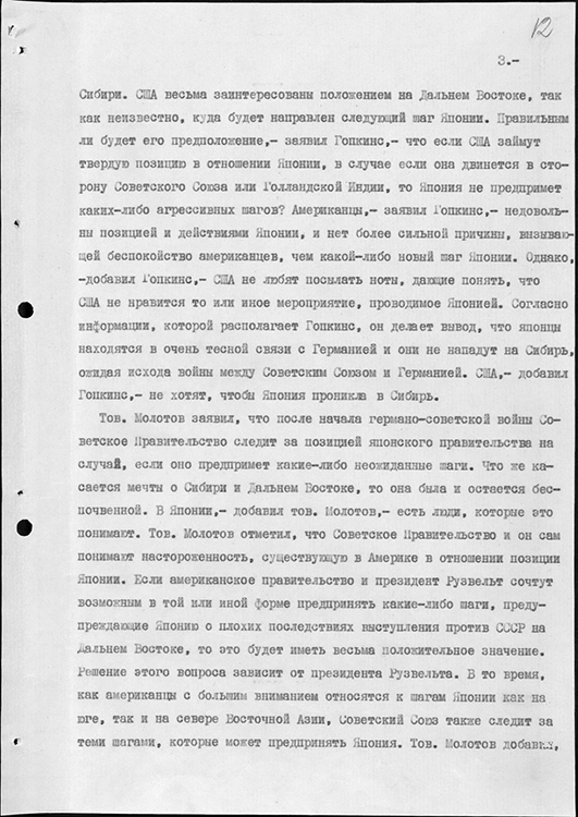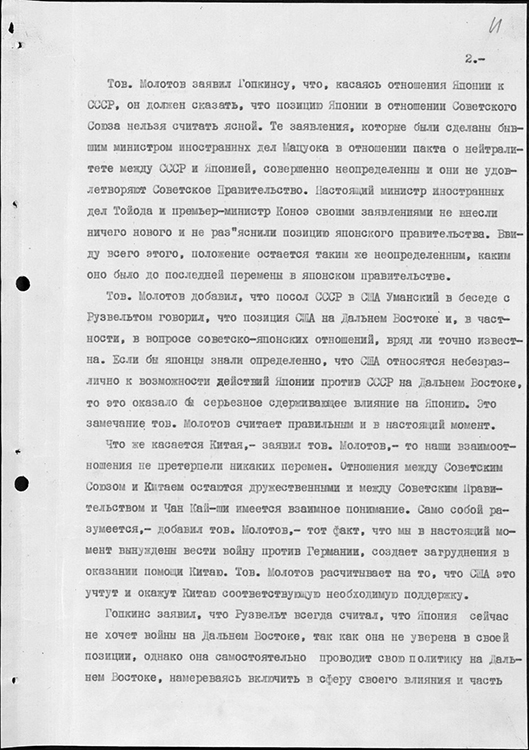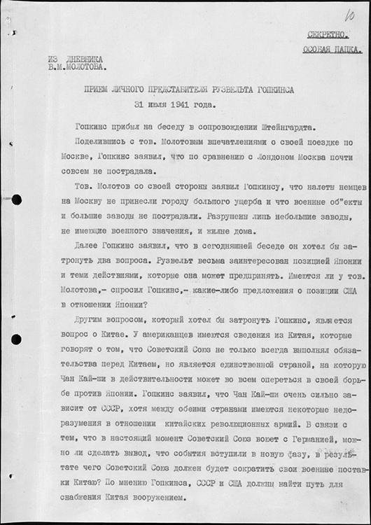 Запись беседы В.М. Молотова с личным представителем президента США Г. Гопкинсом. 31 июля 1941 г. (фото: Историко-документальный департамент МИД России)