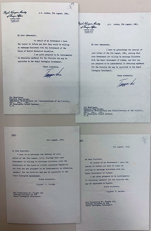 5 августа 1941 г. Письма министра иностранных дел норвежского правительства в изгнании Т.Ли послу СССР в Лондоне И.М.Майскому 5 августа 1941 г. (На англ.яз.) Ответные письма И.М.Майского Т.Ли 5 августа 1941 г. (На англ.яз.)