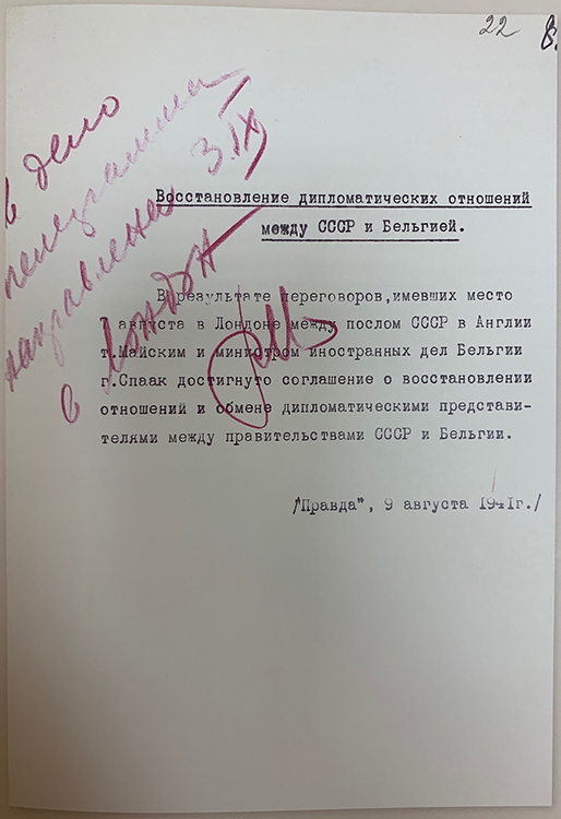 Сообщение для печати в газете «Правда» о восстановлении дипломатических отношений между СССР и Бельгией. 9 августа 1941 г. (фото: Историко-документальный департамент МИД России)