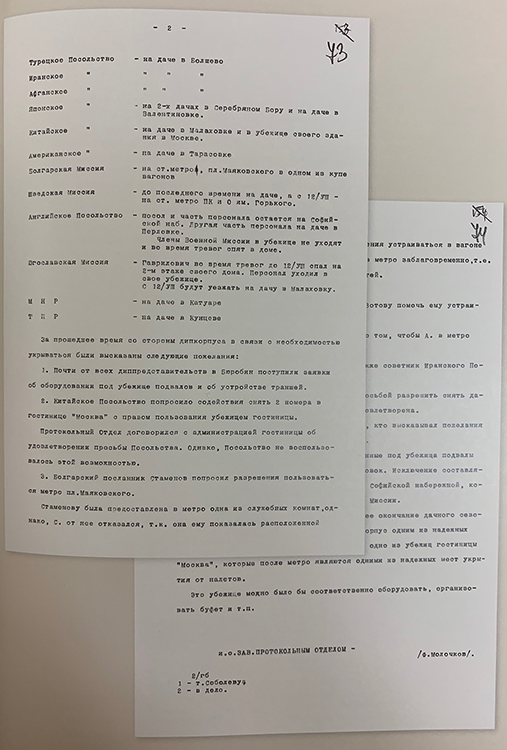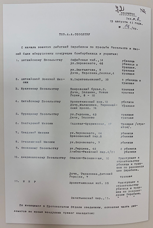 Записка исполняющего обязанности заведующего Протокольным отделом НКИД СССР Ф.Ф.Молочкова генеральному секретарю НКИД СССР А.А.Соболеву об оборудовании бомбоубежищ в посольствах и миссиях в Москве. 13 августа 1941 г. (фото: Историко-документальный департамент МИД России)