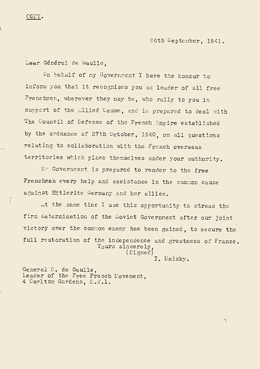 Письмо И.М. Майского руководителю Национального комитета «Свободная Франция» Ш. де Голлю. 26 сентября 1941 г., англ. яз. (фото: Историко-документальный департамент МИД России)