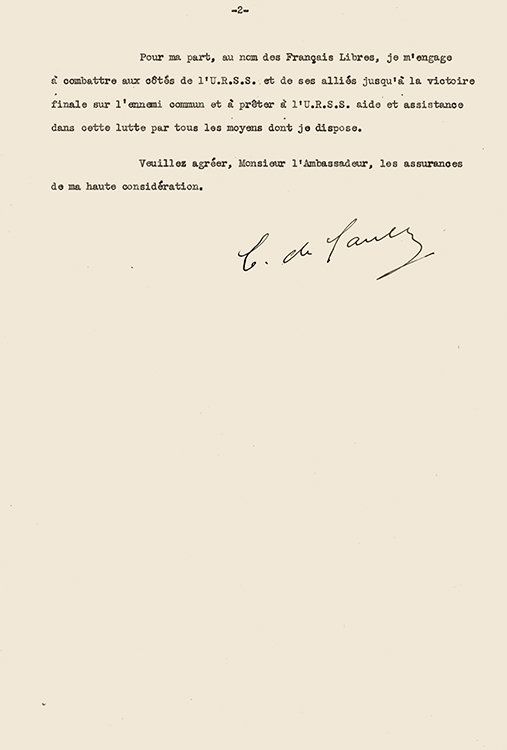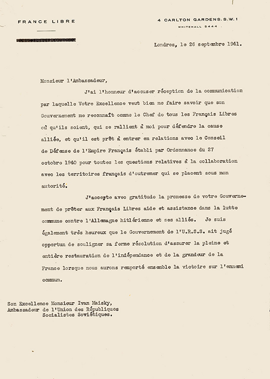Ответное письмо Ш. де Голля И.М.Майскому. 26 сентября 1941 г., франц.яз. (фото: Историко-документальный департамент МИД России)