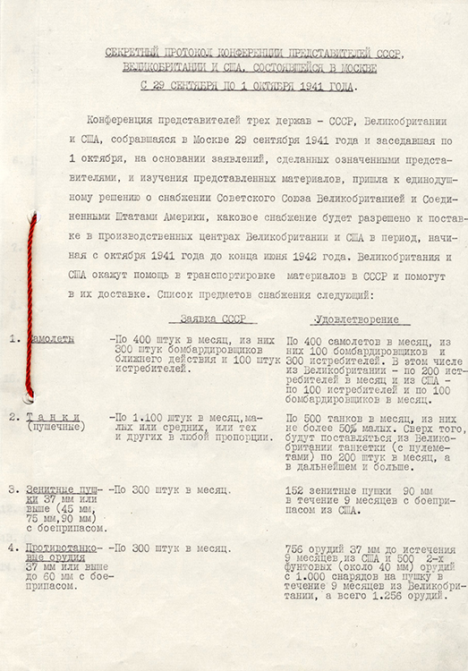 Секретный протокол Московской конференции представителей СССР, США и Великобритании. 1 октября 1941 г. (фото: Историко-документальный департамент МИД России)