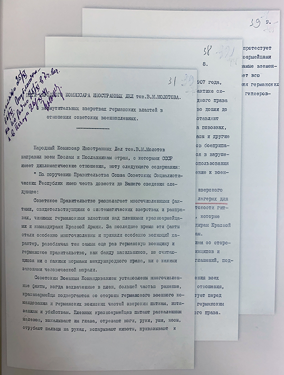 Нота наркома иностранных дел СССР В.М.Молотова «О возмутительных зверствах германских властей в отношении советских военнопленных» посольствам и миссиям, аккредитованным в Москве (фото: Историко-документальный департамент МИД России)