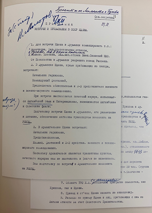 Программа встречи и пребывания в СССР А.Идена. Правка по тексту В.М.Молотова (фото: Историко-документальный департамент МИД России)
