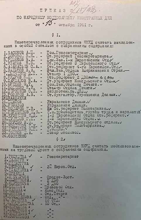 Приказ по НКИД СССР о зачислении сотрудников в особый батальон и мобилизации на трудовой фронт. 15 октября 1941 г. (фото: Историко-документальный департамент МИД России)