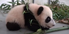 Первая в России панда родилась 24 августа этого года. Она все пытается повторять за своей мамой Диндин и даже старается грызть свежий бамбук, сообщили в Московском зоопарке (фото: Московский зоопарк/ТАСС)