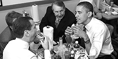 Президенты заказали две «Колы» и «Нести» и по большой тарелке с бургером и картофелем фри. Медведев заказал себе бургер с луком, салатом, помидорами и сыром «Чеддер», Обама - с луком, сыром «Чеддер», перчиками холопенья и грибами. При этом порцию картошки фри президенты поделили пополам (фото: Reuters)