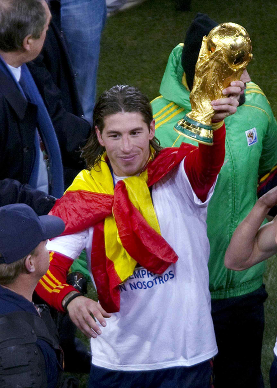 Правый защитник «Красной фурии» Серхио Рамос по праву держит в руках Кубок мира – его знаменитые проходы по флангу не раз приводили в ужас защитников (фото: Rex Features/Fotobank.ru)