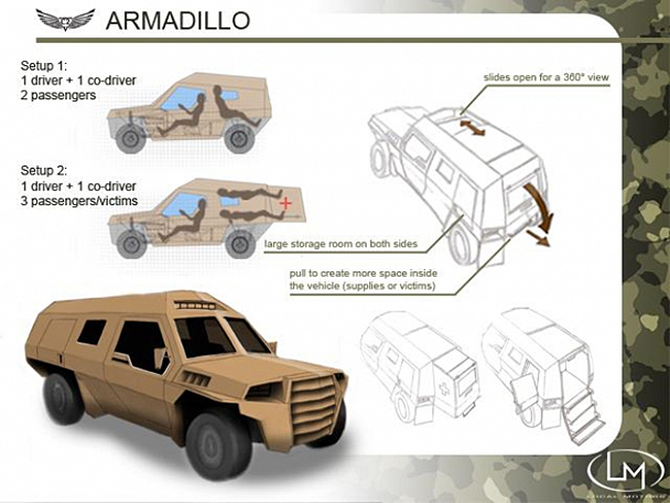Armadillo – автомобиль с расширенной задней частью, которая позволяет комфортно расположиться трем раненым бойцам. Armadillo в базовой конфигурации имеет два пассажирских места для оказания медицинской помощи. Также машина снабжена широкими обзорными окнами и раздвижной крышей для кругового осмотра (фото: local-motors.com)