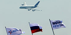 На открытии международного авиасалона МАКС-2011 в Жуковском публике удалось увидеть региональный реактивный самолет нового поколения Ан-158 (на первом плане) и пассажирский самолет Airbus A380 (на дальнем плане) (фото: ИТАР-ТАСС)