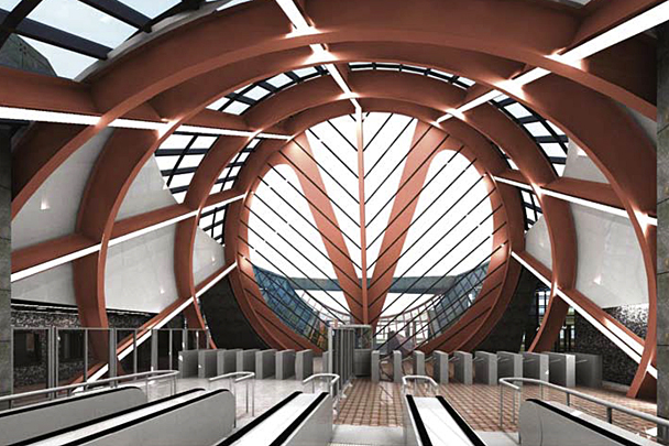 «Бухарестская», как и «Международная», должна быть открыта в 2012 году. Архитектурное оформление связано с названием станции и должно напоминать виды румынской столицы – города Бухареста (фото: kapitel-spb.ru)