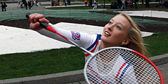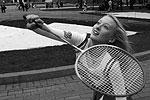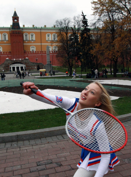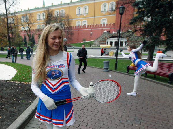 В среду у стен Кремля девушки из группы Medvedev Girls провели сеанс игры в бадминтон. В начале неделе президент Медведев в своем блоге разместил видеоролик о пользе бадминтона, рассказав, что «эта игра развивает физическую форму, глазомер, точность, реакцию». Впрочем, данную акцию быстро пресекли сотрудники правоохранительных органов (фото: РИА "Новости")