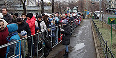 Даже относительно быстрая очередь из семей с детьми тянется по улице на километры (фото: Константин Кобяков/ВЗГЛЯД)