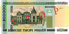 Небывалая инфляция (108,7% по итогам года), резко влетевшая после кризиса, который поразил республику весной прошлого года, приводит к тотальному обесцениванию местной валюты. Сейчас 200 тысяч белорусских рублей равняются 25 долларам по официальному курсу. В Белоруссии активно муссируются слухи о грядущей деноминации, уже третьей по счету после развала СССР. При этом замглавы Нацбанка Владимир Сенько заявил, что не исключает выпуск вскоре банкноты большего номинала. На новой банкноте изображен Могилевский областной художественный музей им. Масленникова (фото: nbrb.by)