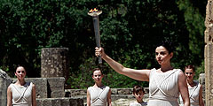 Перед тем как зажечь огонь, «верховная жрица» Ино Менегаки произнесла «молитву» Аполлону, чтобы он послал лучи и зажег огонь Олимпиады, а также Зевсу, которому было посвящено святилище в Олимпии, чтобы тот увенчал победителей игр венками (фото: Reuters)