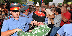 Полицейским пришлось силой оттеснять разбушевавшихся противников выставки. Часть из активистов были доставлены в дежурную часть полиции по Западному округу города для составления протоколов, потом их отпустили (фото: ИТАР-ТАСС)