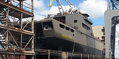 Корабль на килевых тележках движется в сторону плавучего дока (фото: Илья Стулов/ВЗГЛЯД)
