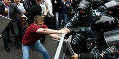 В один момент участники акции попытались прорвать милицейский кордон, начали бросать в правоохранителей пластиковые бутылки. Кем-то из участников столкновений был распылен слезоточивый газ. Милиция утверждает, что газ не применяла (фото: Reuters)