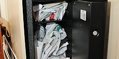 На фото, опубликованном на официальном сайте московской полиции, сейф в квартире Ксении Собчак. В нем во время обыска обнаружены крупные суммы в иностранной валюте, долларах и евро, разложенные по конвертам (фото: petrovka38.ru)
