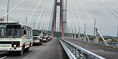 В церемонии открытия тестового движения по мосту принял участие председатель правительства России Дмитрий Медведев. Планируется, что движение по мосту общественного и городского транспорта будет пущено 1 августа 2012 года (фото: ИТАР-ТАСС)